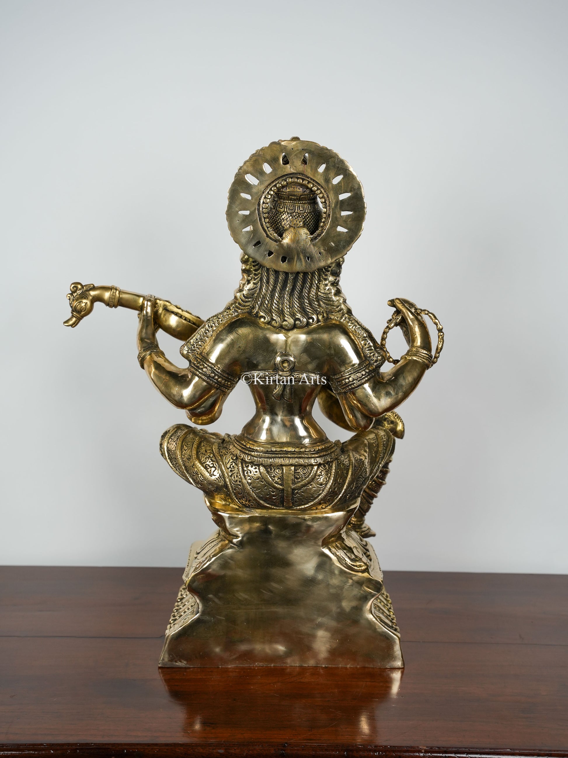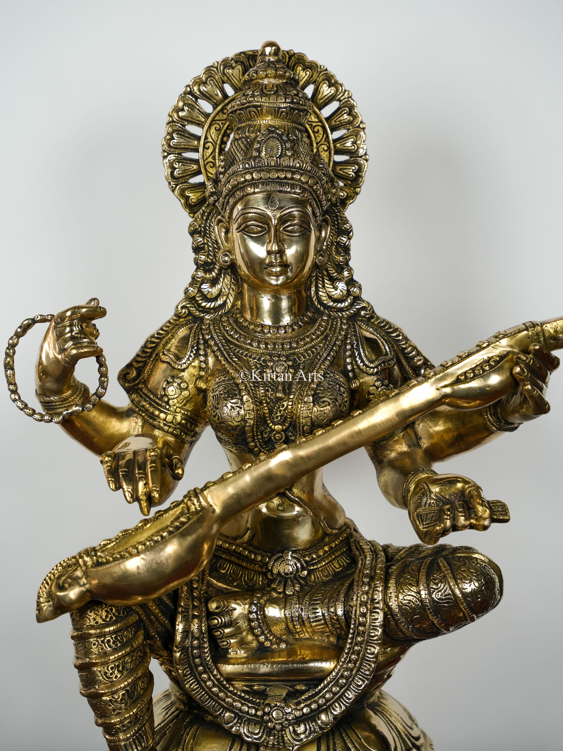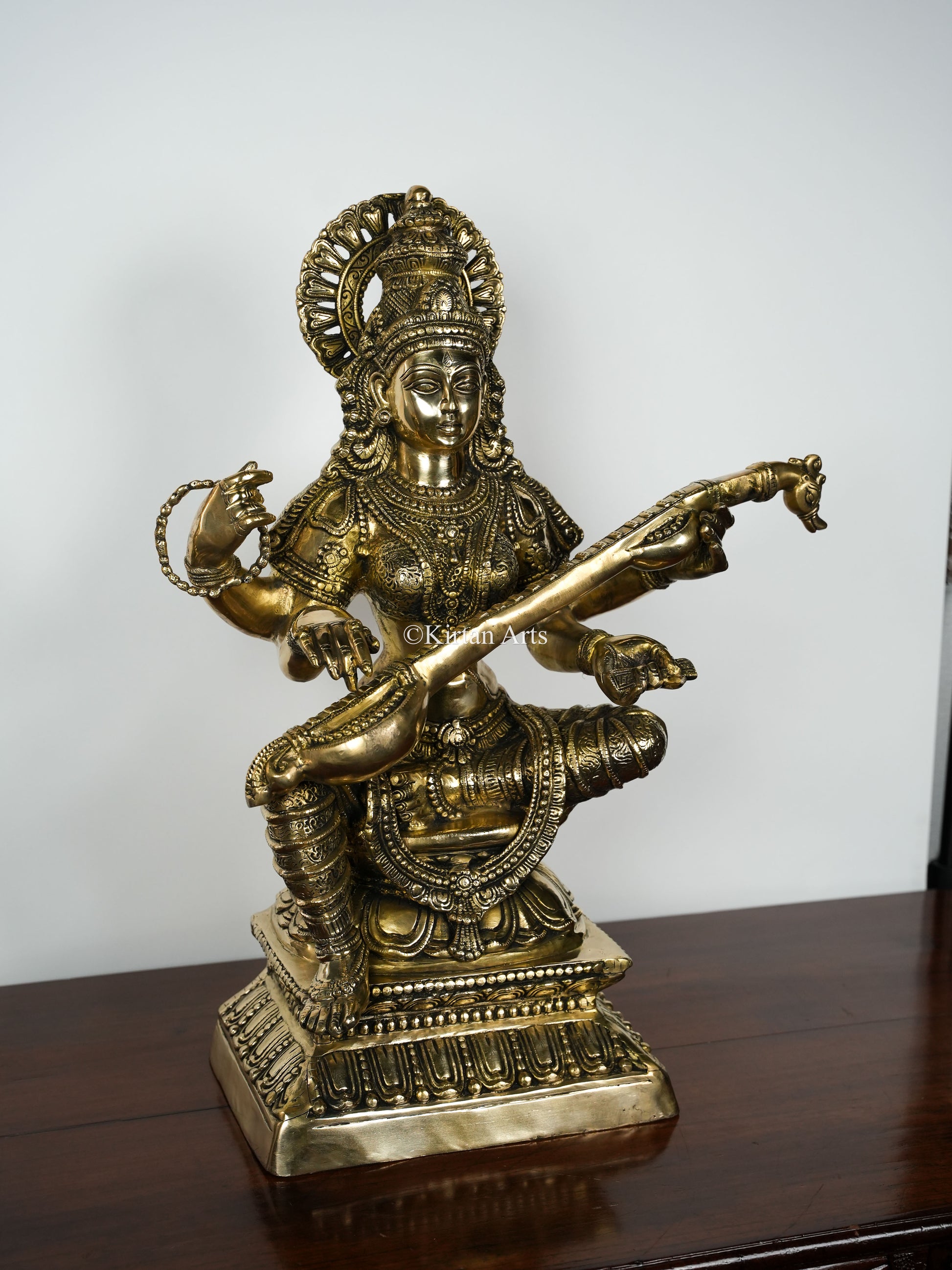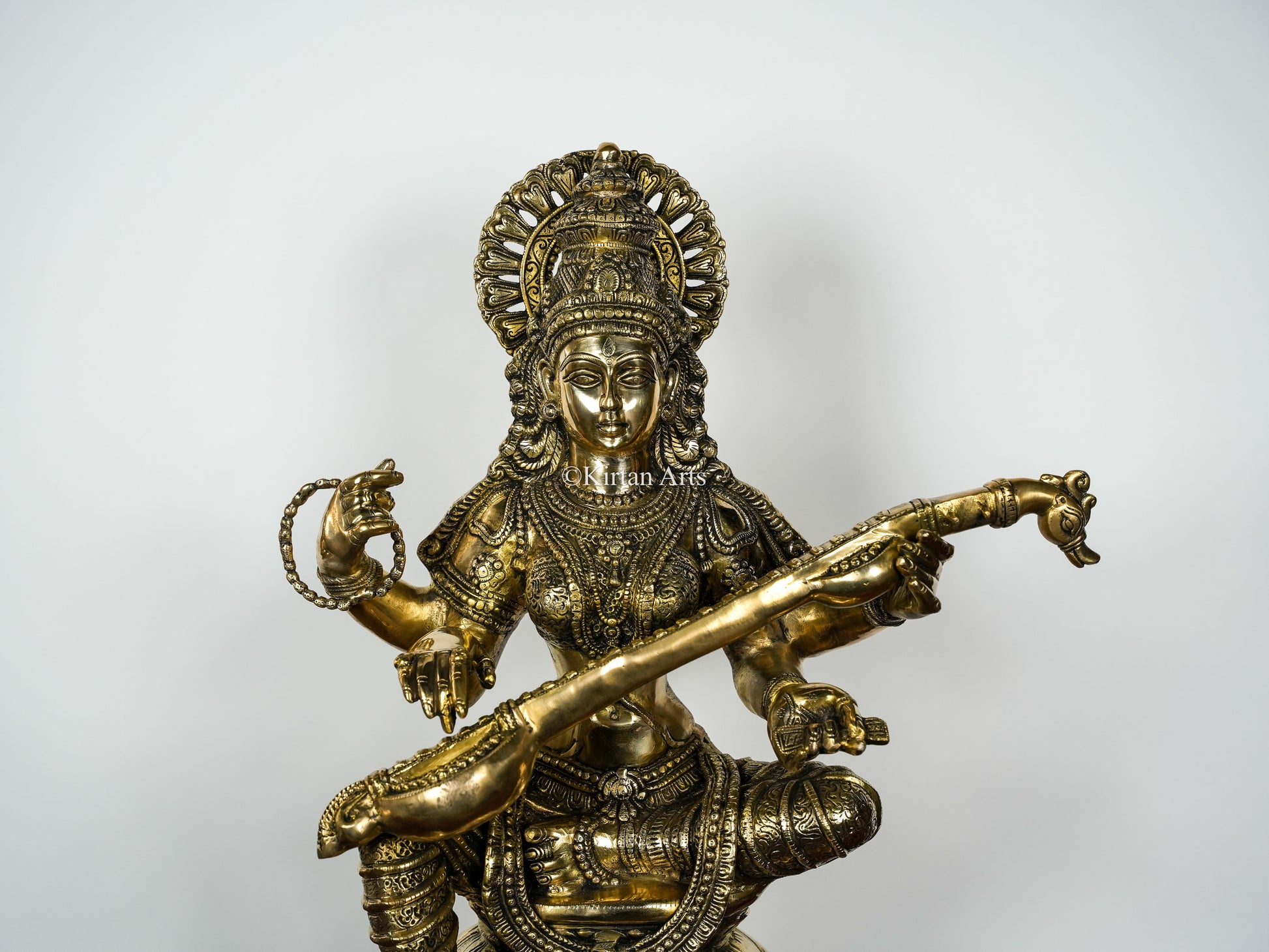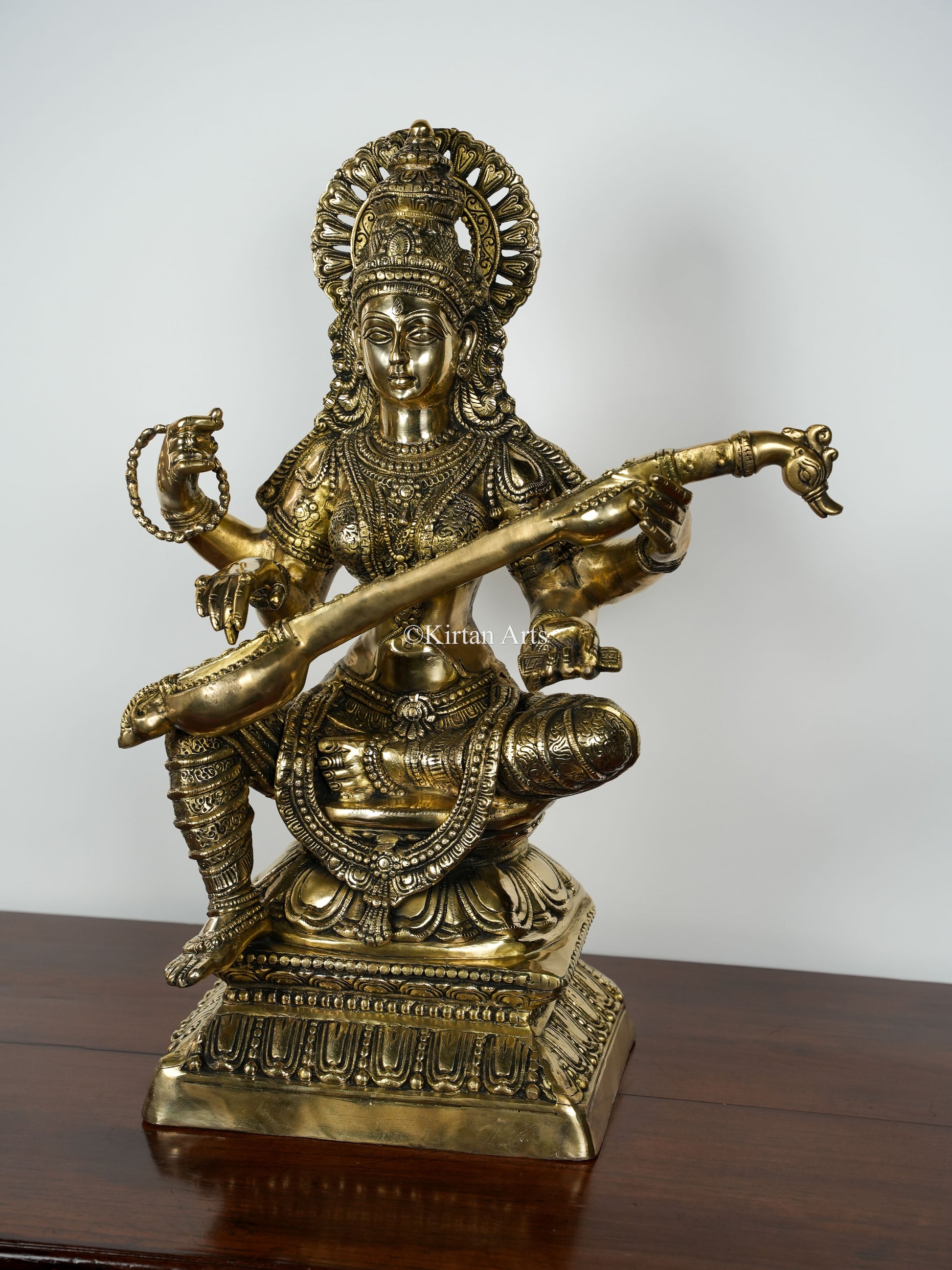 Beautifully handcrafted brass idol of Saraswati Devi. The murti is handmade by skilled artisans and is given an antique gold finish.