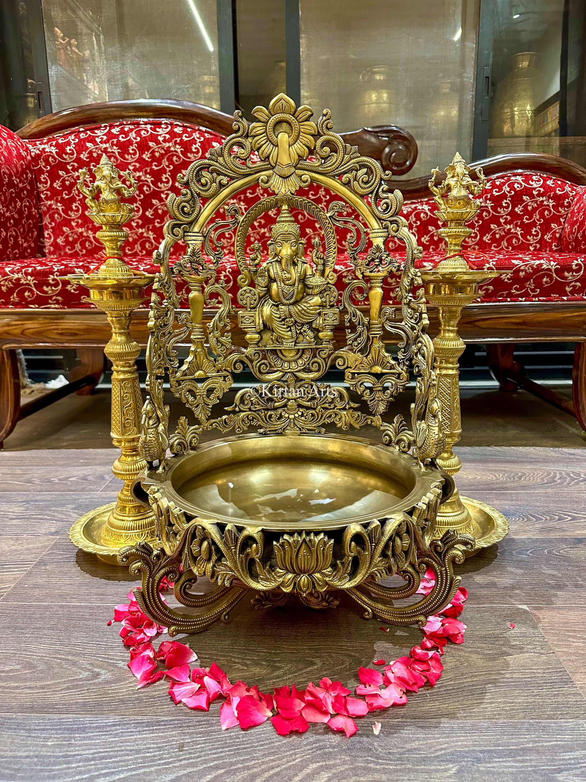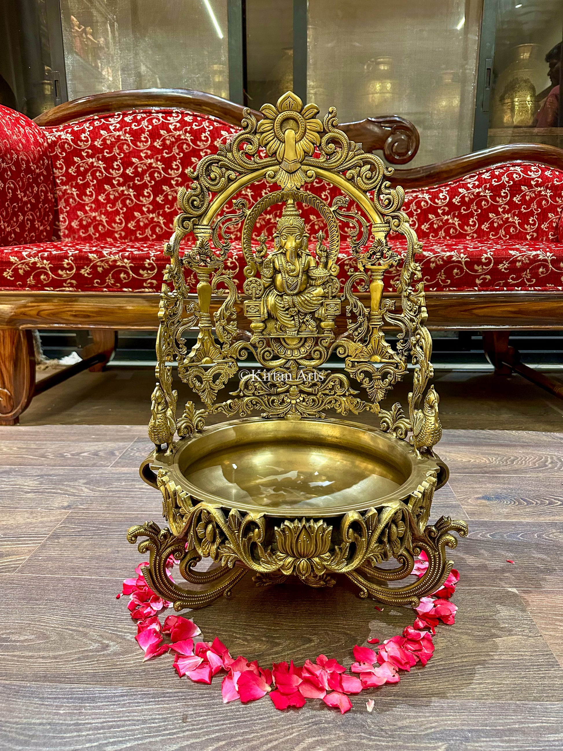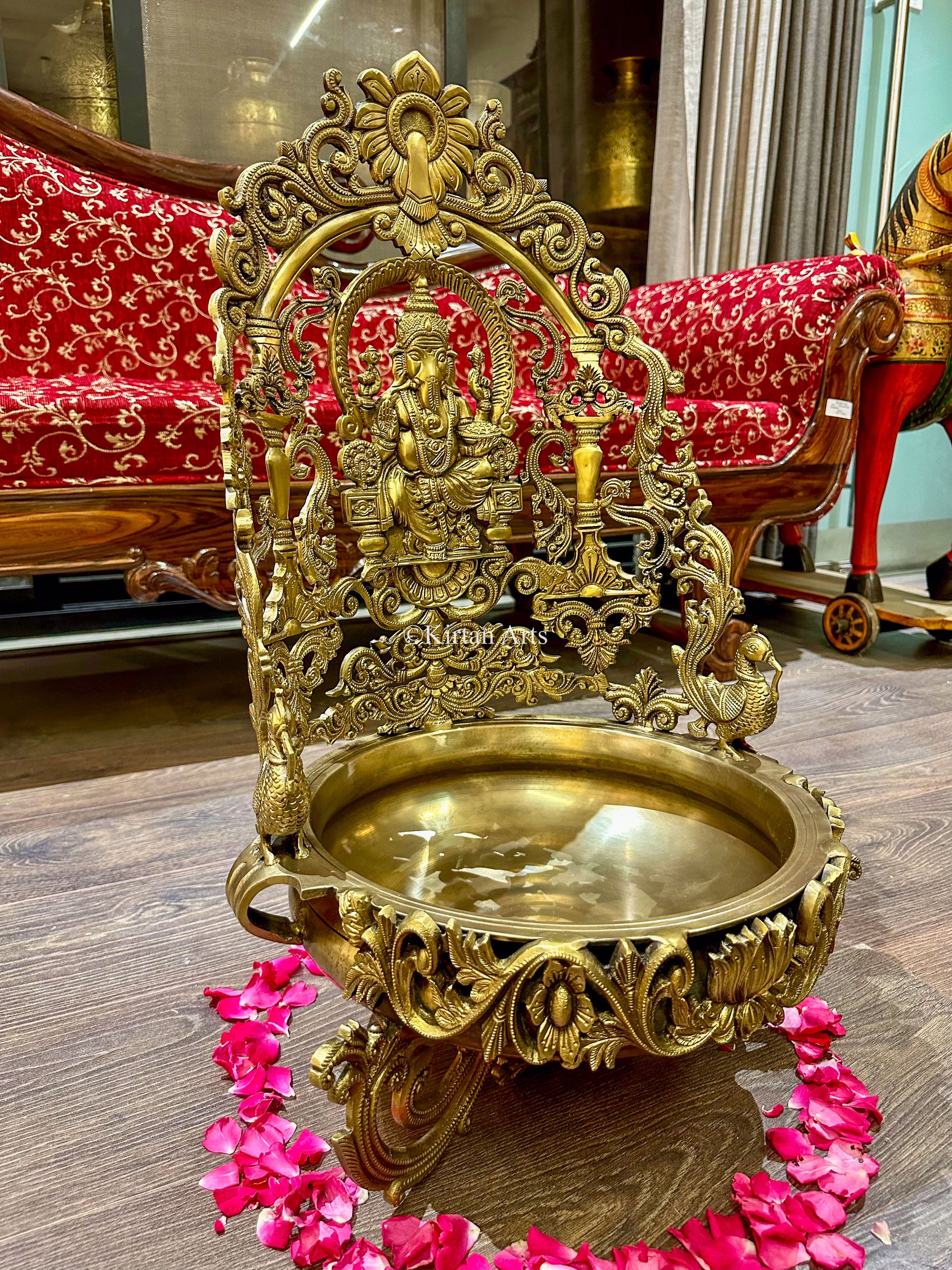 This distinguished Lord Ganesha Urli showcases masterful bronze craftsmanship with elaborate detailing, bringing an air of elegance to any environment. A symbol of auspiciousness and abundance, this refined decorative vessel celebrates divine blessings while elevating your interior aesthetic with timeless grace and cultural significance.