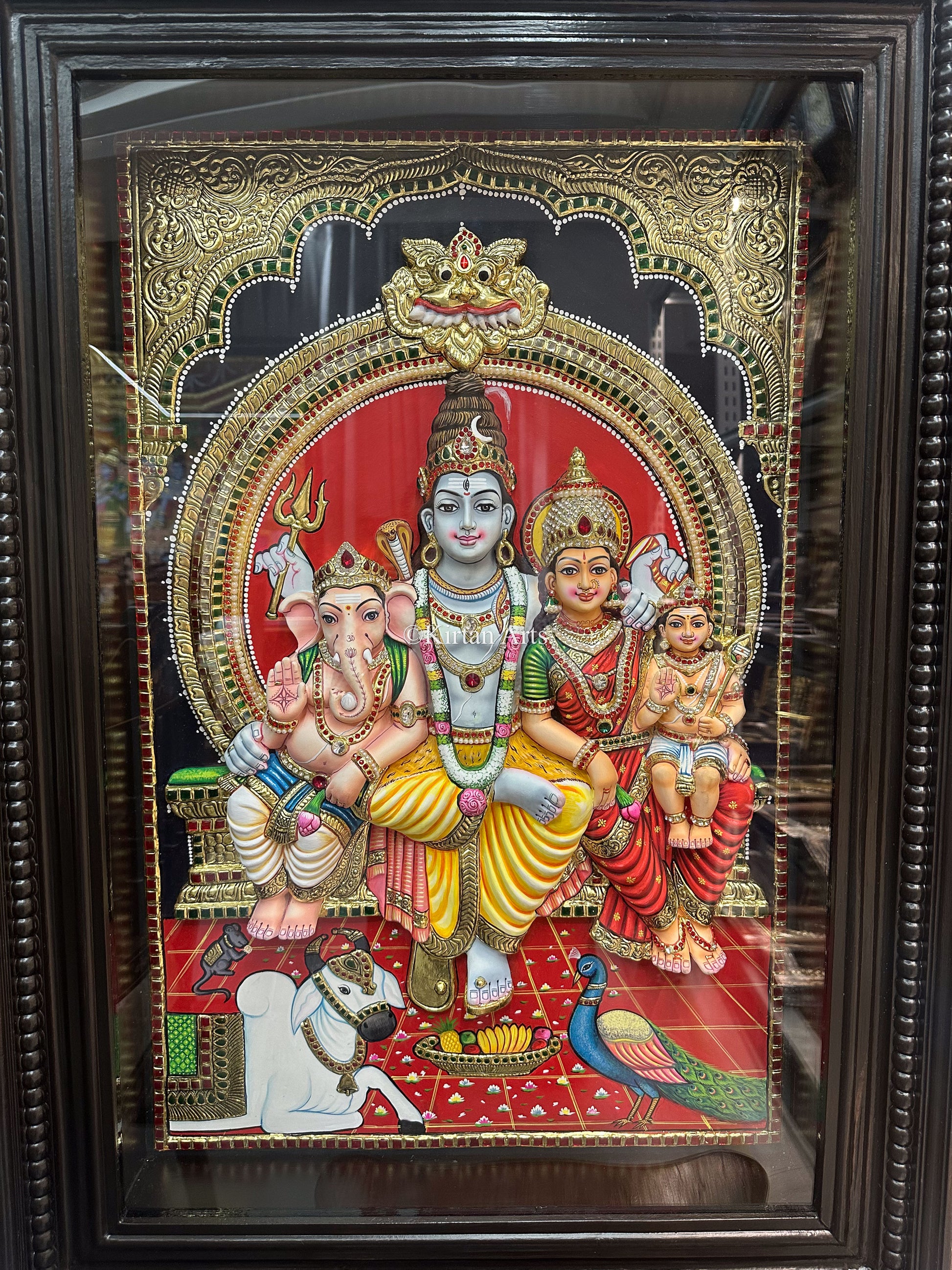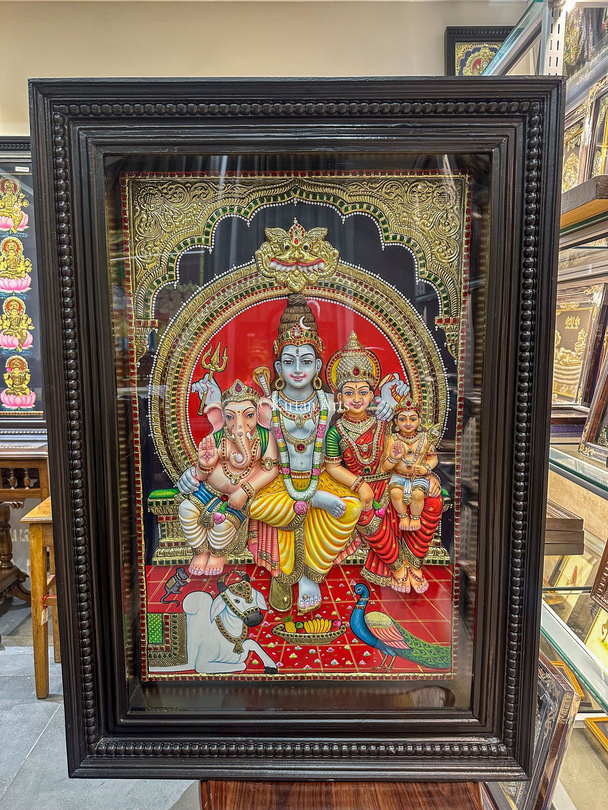 Embodying the finest traditions of South Indian artistry, this exquisite 3D embossed Tanjore painting captures the divine family of Lord Shiva with remarkable depth and detail. Enhanced with authentic 22k gold leaf accents and housed in a distinguished Teakwood frame, this work represents a harmonious blend of spiritual reverence and artistic excellence.