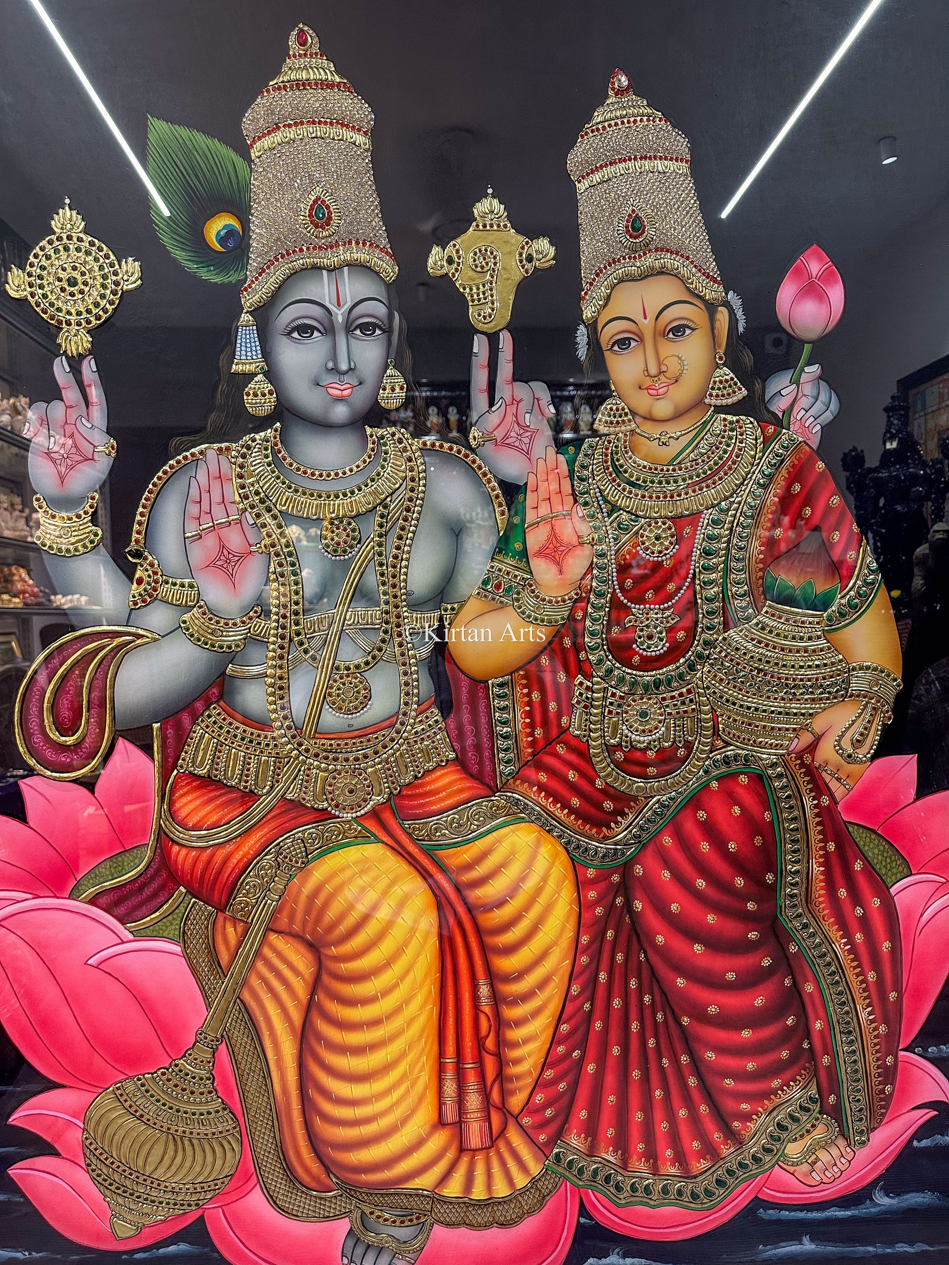 Lord Vishnu and Goddess Lakshmi on Lotus | Tanjore Painting | 22k Gold | 5x4 ft