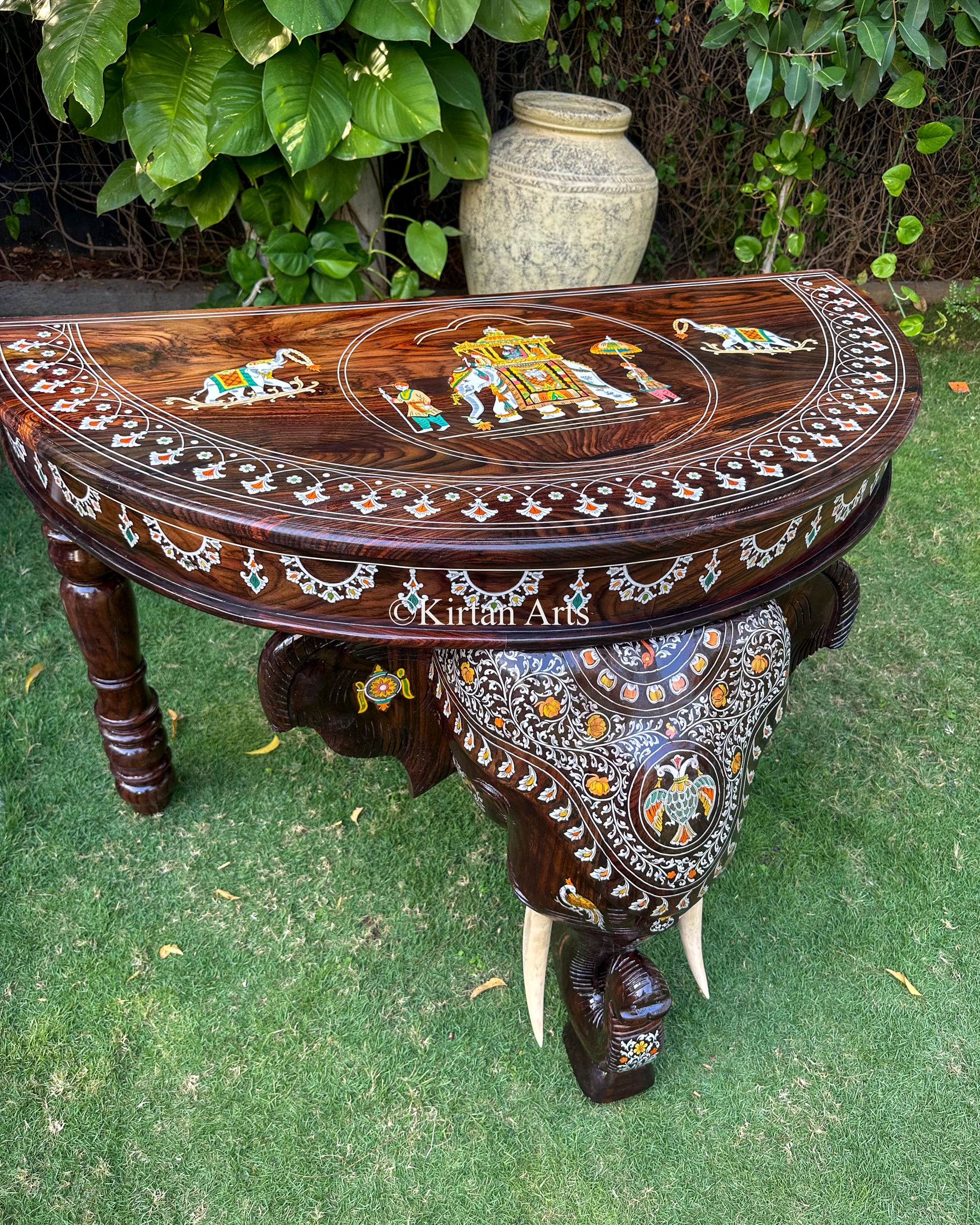 Stunning Rosewood Elephant Console Table, featuring an impressive 12x10 inch elephant head and trunk up design with intricate inlay work. This exceptional piece boasts unique inlay work and is designed for easy disassembly, facilitating easy storage and shipping.