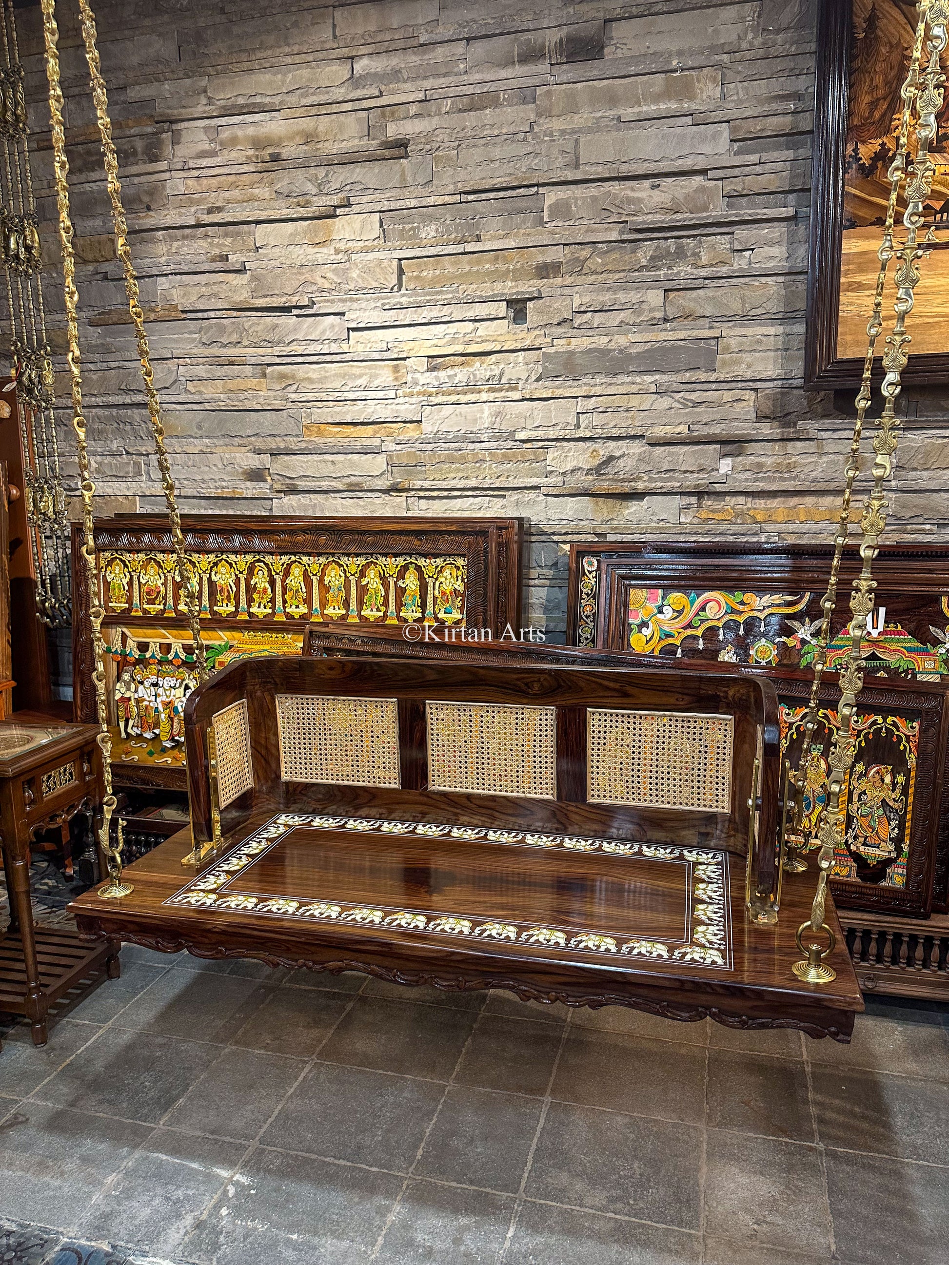 Experience the perfect marriage of traditional craftsmanship and refined elegance with this exquisite reversible swing from Kirtan Arts. Handcrafted from premium Indian rosewood, it showcases intricate elephant inlay detailing and authentic rattan embellishments that celebrate artisanal heritage. Complemented by sophisticated brass hardware and durable chains, this versatile piece elevates any interior or garden setting with timeless sophistication and enduring quality.