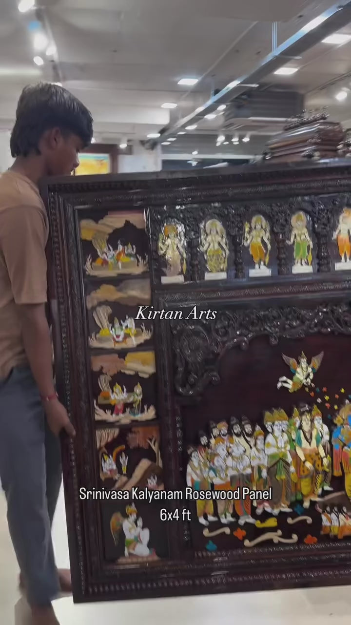 Srinivasa Kalyanam, the celestial marriage of Lord Balaji with Goddess Padmavathi, depicted beautifully in handcrafted 3D embossed art on wood. The panel is made from Rosewood and the embossed artwork is made from wooden pieces to create the 3D effect. Handcrafted Dasavatar of Lord Vishnu, adorn the top portion of the panel, for a divine picture. A thick rosewood mani frame completes the panel for a festive look.