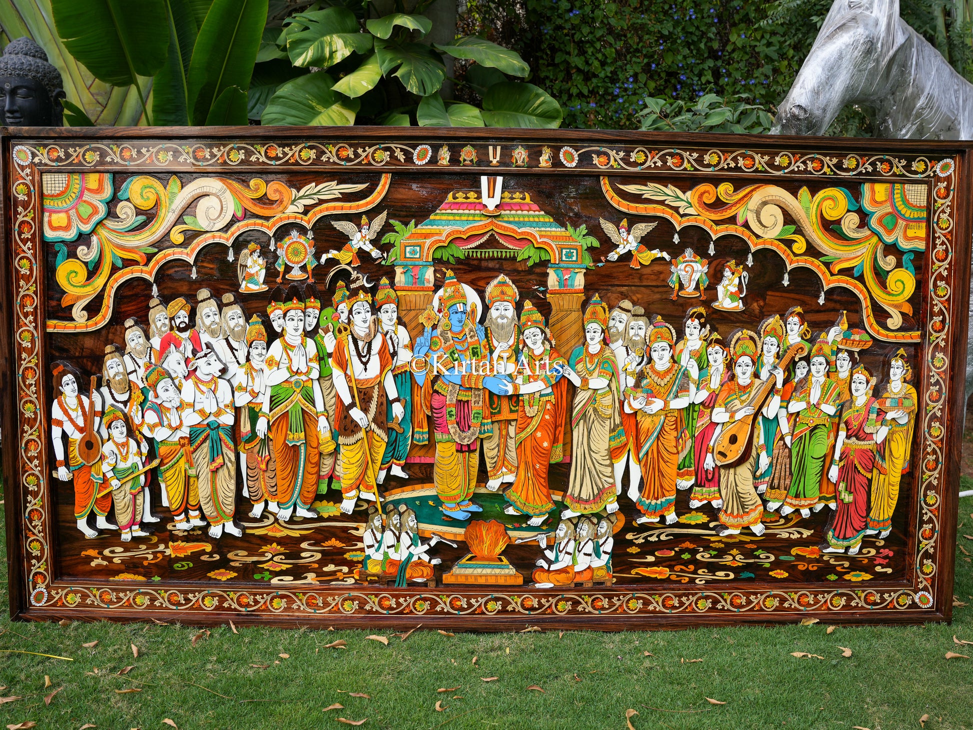 Srinivasa Kalyanam, the divine union of Lord Balaji and Goddess Padmavathi, is intricately depicted in handcrafted 3D embossed art on wood. The Rosewood panel features embossed wooden pieces, creating a striking 3D effect. A beautifully crafted rosewood frame with floral inlay work completes the panel.