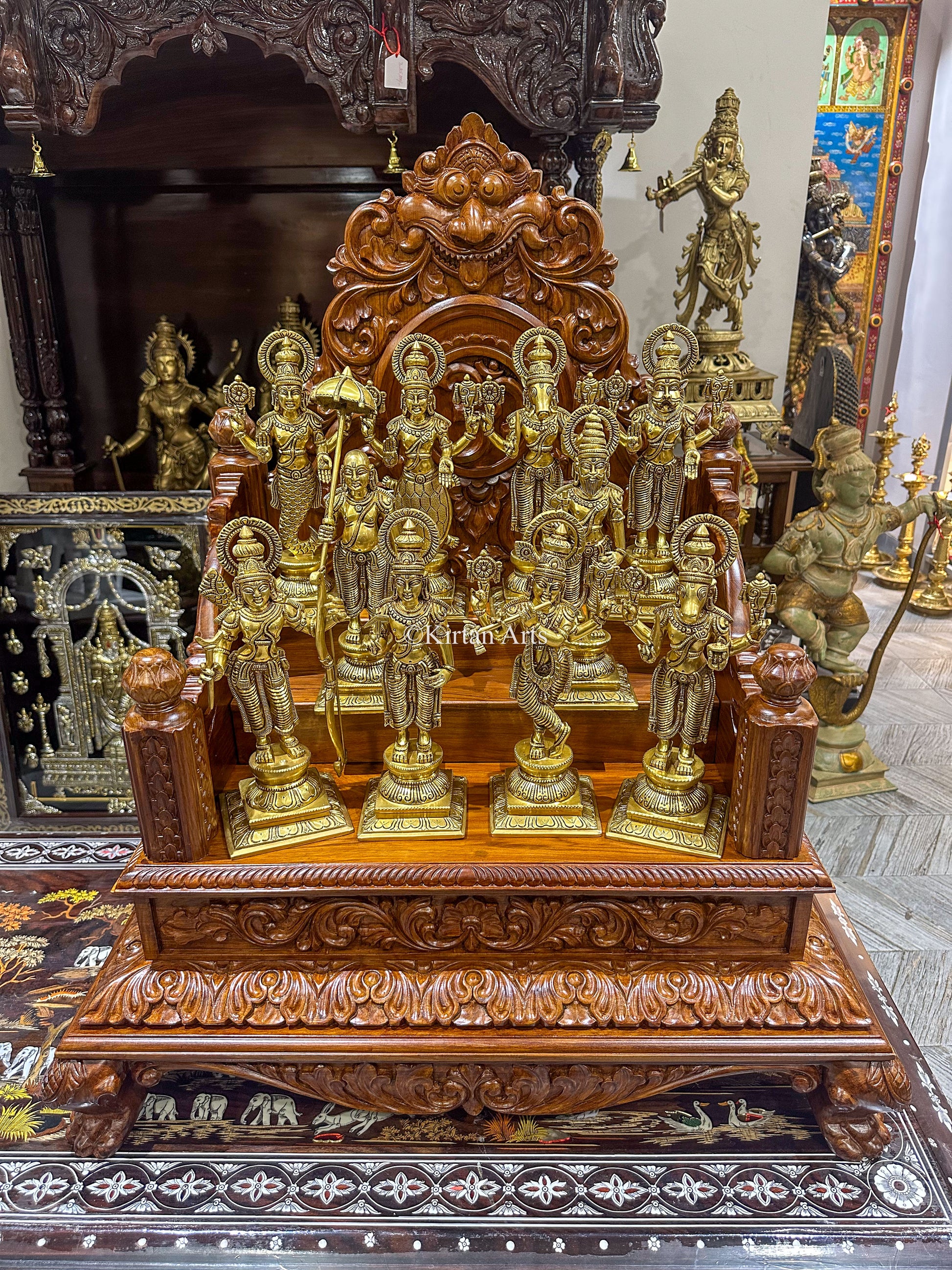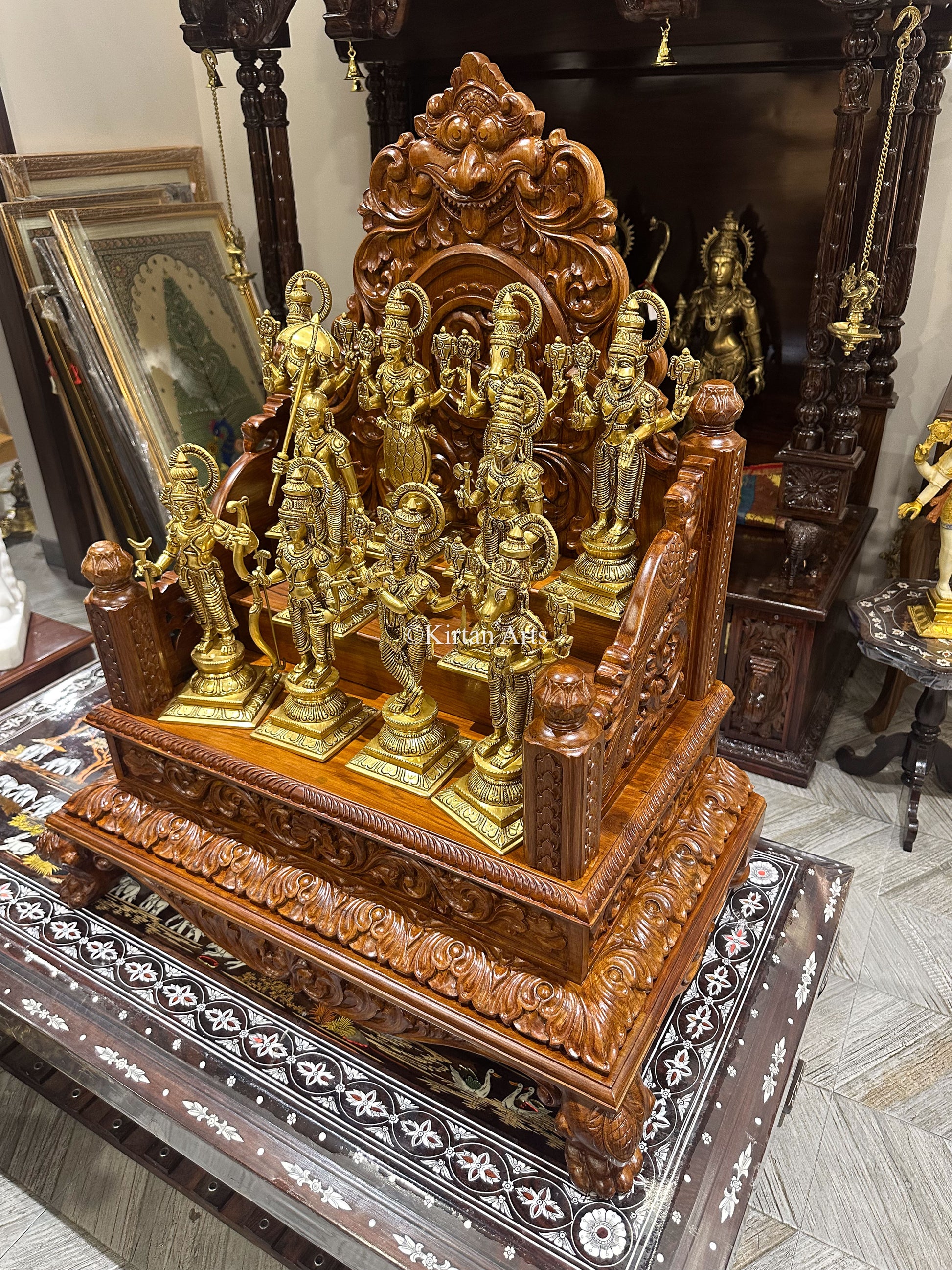 Bring serenity to your space with this exquisite handcrafted set of Lord Vishnu Dasavatar in brass, showcasing intricate details and divine features in a set of ten pieces. The murtis are elegantly placed on our hand-carved Teakwood Mandasana.