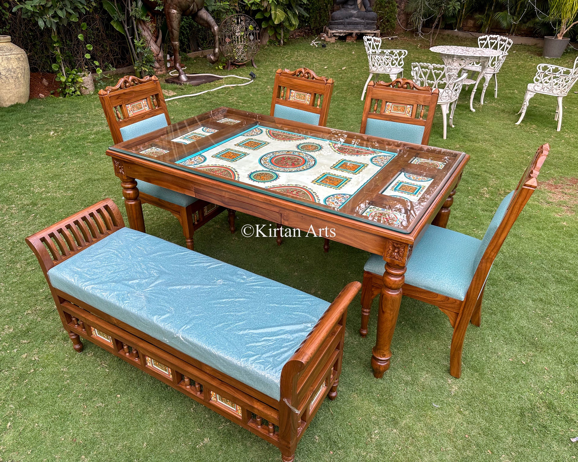 Teakwood Artisan Dining Set | 6 Seater w Bench | Dhokra Artwork