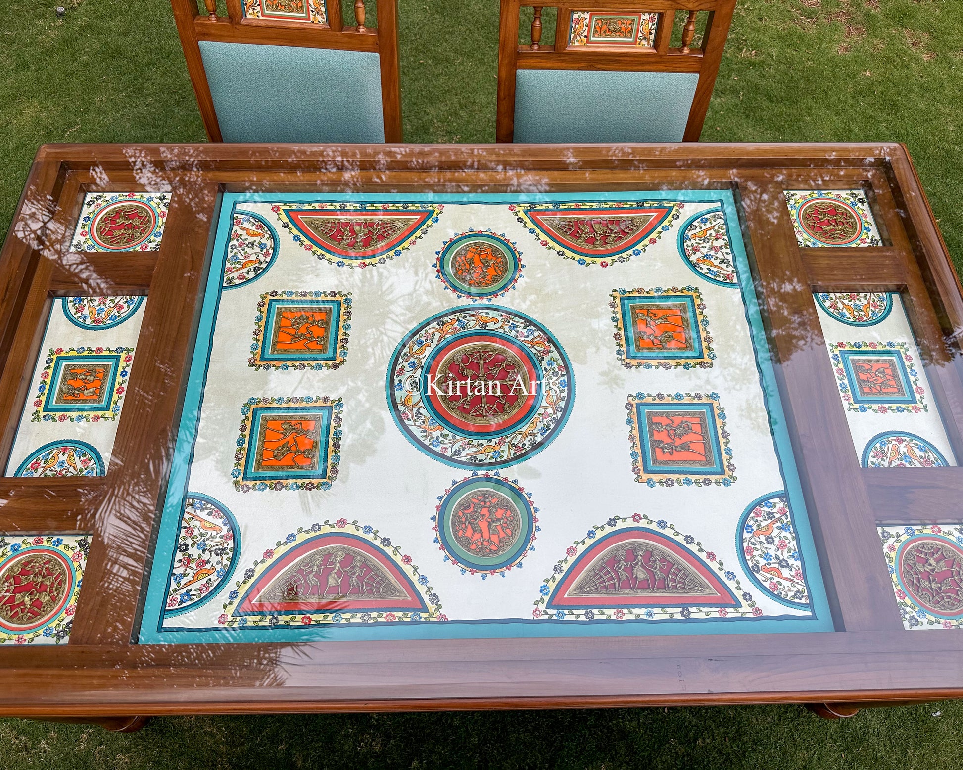 Elevate your dining space with this exquisite fusion of traditional Indian craftsmanship and modern utility. This premium set features a high-grade Teak Wood build, intricately detailed with authentic Dhokra (brass metal) artwork and hand-painted motifs, all protected under a sleek toughened glass top.
