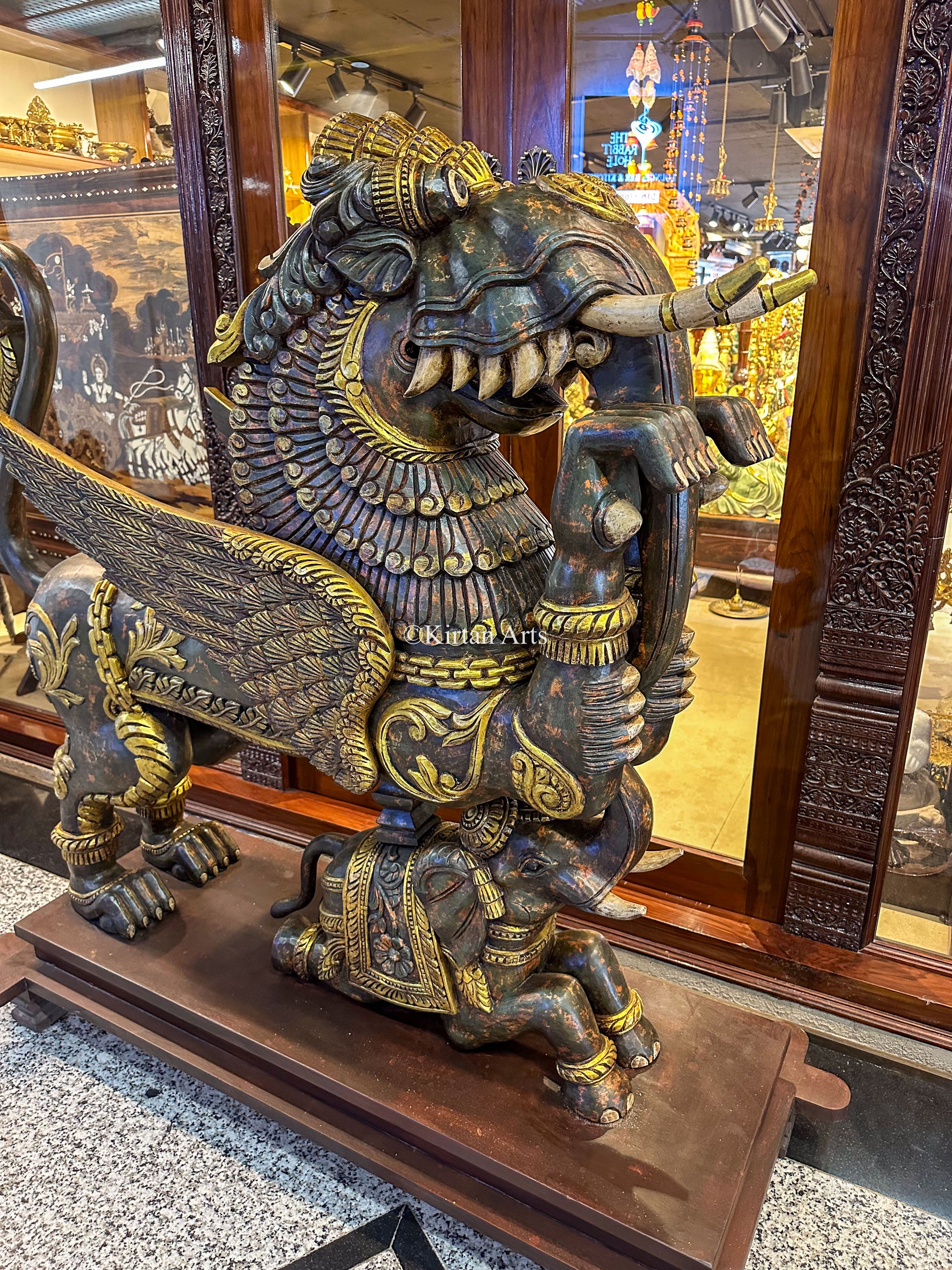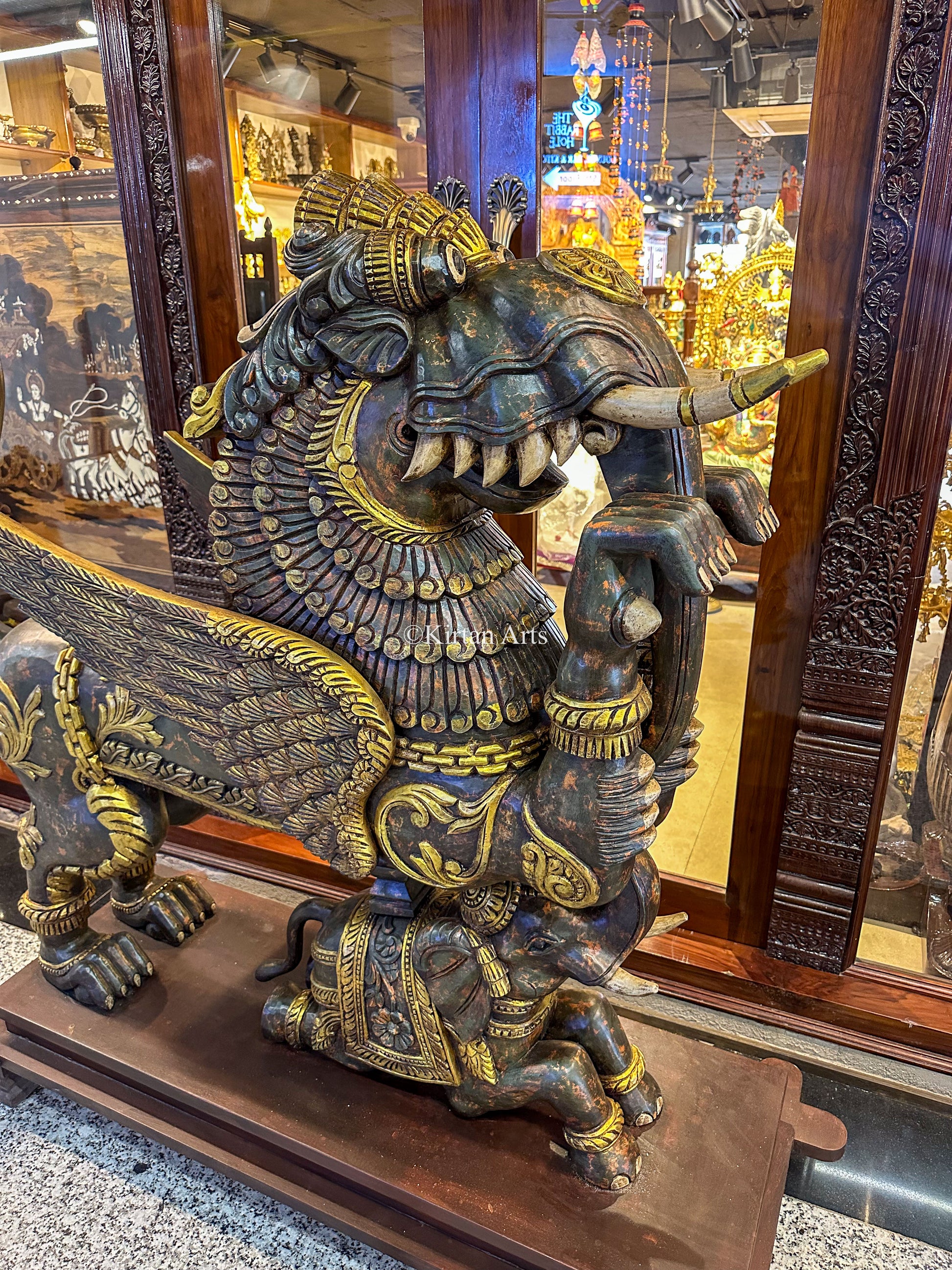 Majestic wooden sculpture of Gaja Yali hand carved by skilled artisans and given a distressed golden finish. The Yali will make a great accent piece and will go with either modern or traditional interiors.