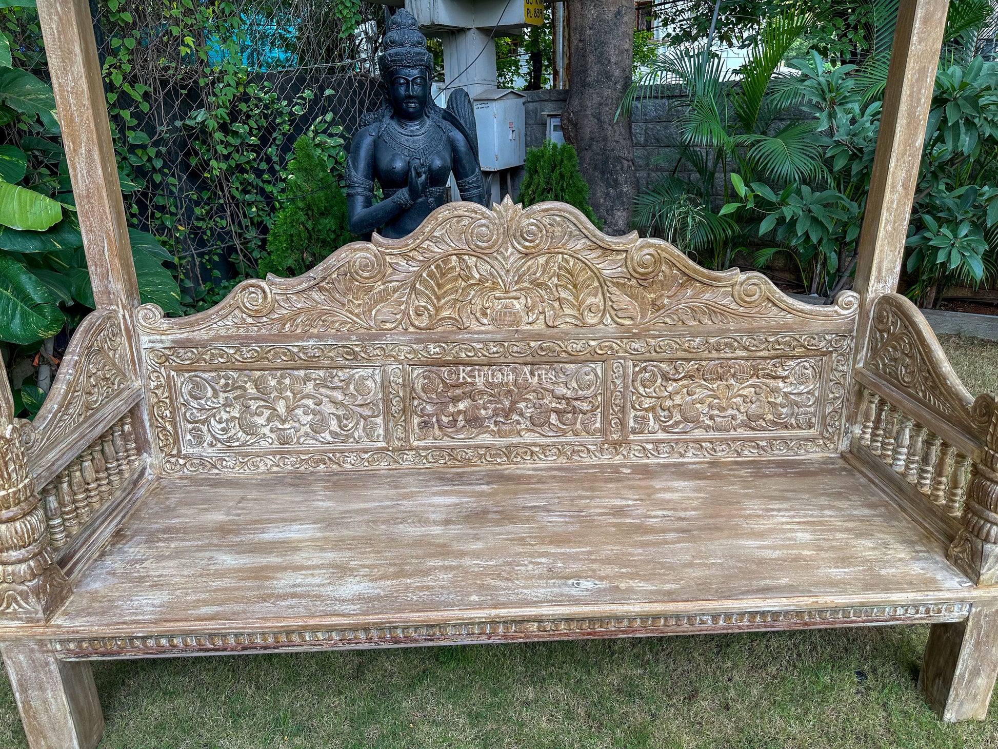 Enhance your outdoor area with this beautifully crafted wooden day bed, perfect for balconies or outdoor spaces, offering multiple uses. The elegant carvings on the back and sides add a touch of sophistication, complemented by a distressed finish.